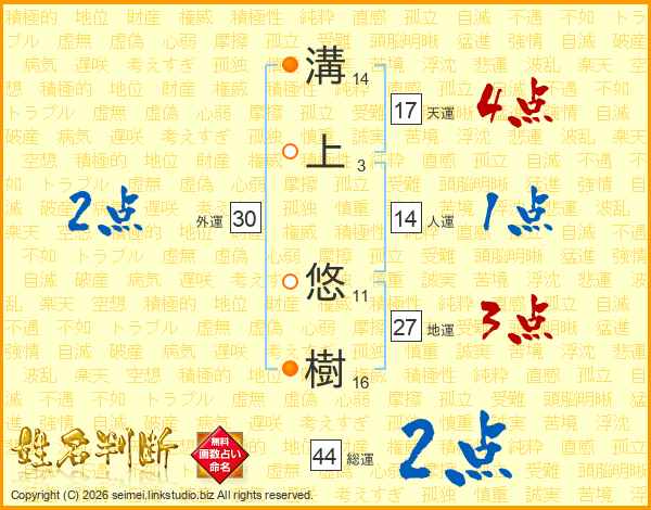 溝(14画)上(3画) 悠(11画)樹(16画)