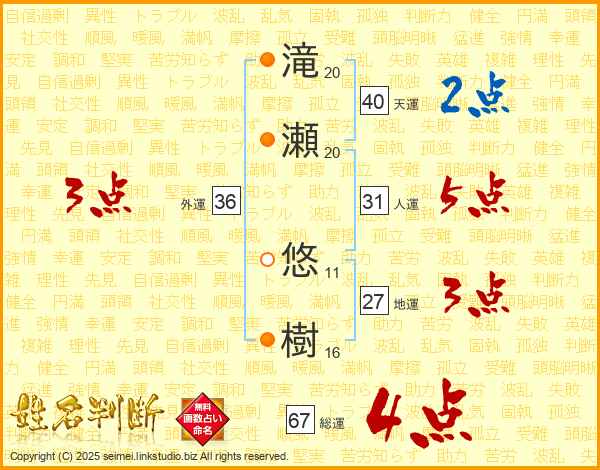 滝(20画)瀬(20画) 悠(11画)樹(16画)