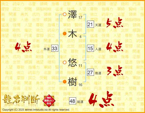 澤(17画)木(4画) 悠(11画)樹(16画)