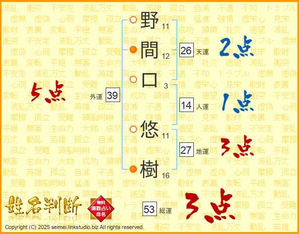 野(11画)間(12画)口(3画) 悠(11画)樹(16画)