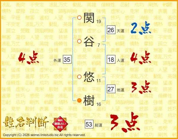 関(19画)谷(7画) 悠(11画)樹(16画)