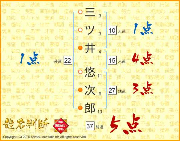 三(3画)ツ(3画)井(4画) 悠(11画)次(6画)郎(10画)