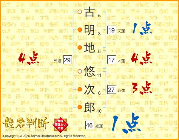 古(5画)明(8画)地(6画) 悠(11画)次(6画)郎(10画)