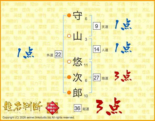 守(6画)山(3画) 悠(11画)次(6画)郎(10画)