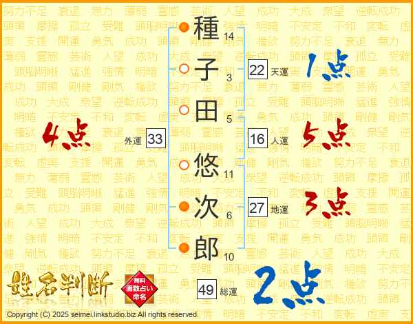 種(14画)子(3画)田(5画) 悠(11画)次(6画)郎(10画)