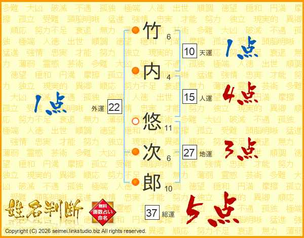 竹(6画)内(4画) 悠(11画)次(6画)郎(10画)