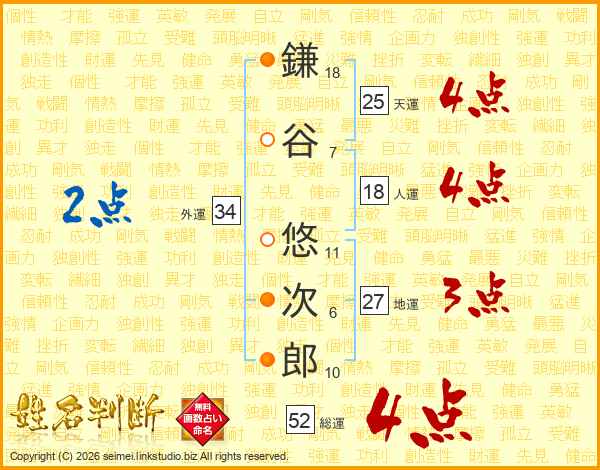 鎌谷悠次郎さんの総運は52画の4点!