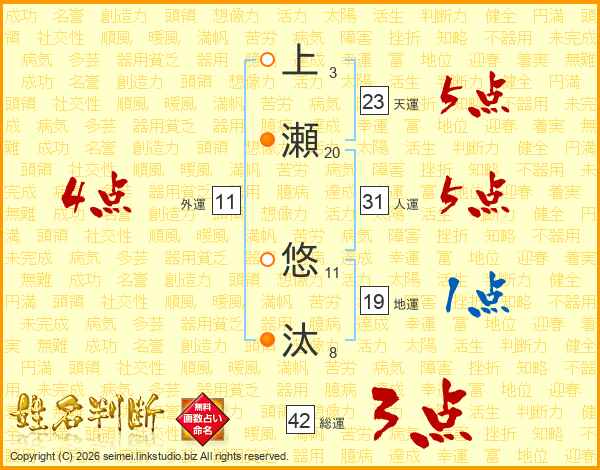 上(3画)瀬(20画) 悠(11画)汰(8画)