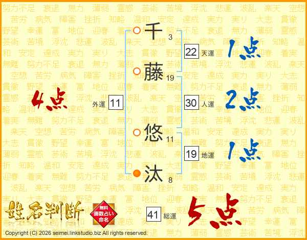 千藤悠汰さんの総運は41画の5点!