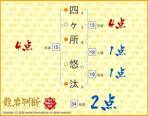 四(4画)ヶ(3画)所(8画) 悠(11画)汰(8画)