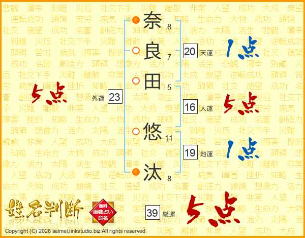 奈(8画)良(7画)田(5画) 悠(11画)汰(8画)