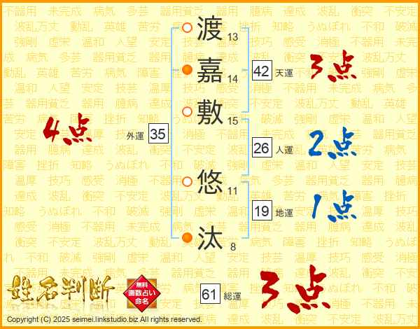 渡(13画)嘉(14画)敷(15画) 悠(11画)汰(8画)