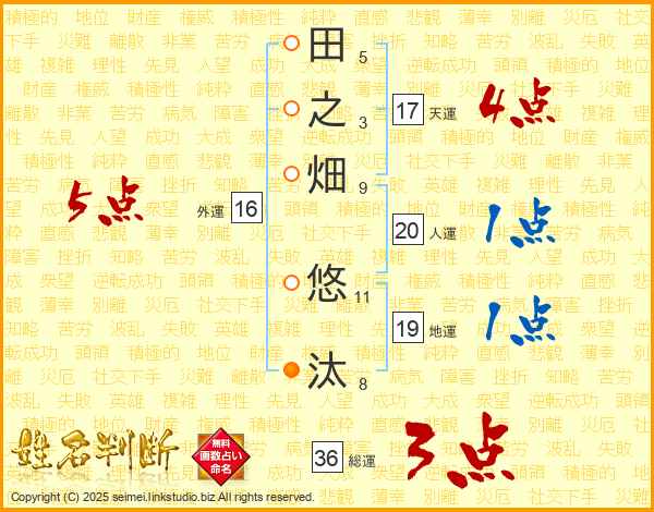 田(5画)之(3画)畑(9画) 悠(11画)汰(8画)