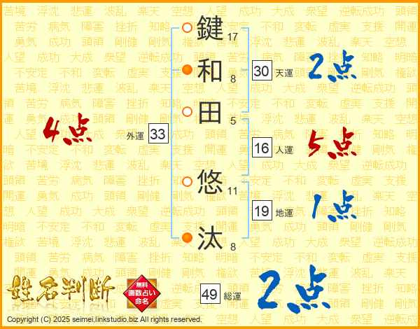 鍵(17画)和(8画)田(5画) 悠(11画)汰(8画)