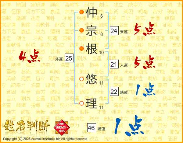 仲(6画)宗(8画)根(10画) 悠(11画)理(11画)