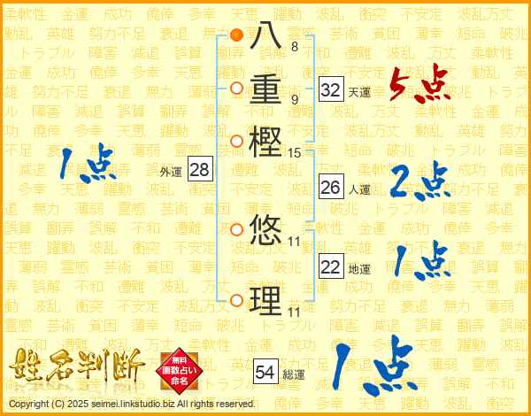 八(8画)重(9画)樫(15画) 悠(11画)理(11画)