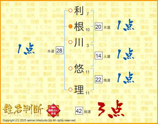利(7画)根(10画)川(3画) 悠(11画)理(11画)