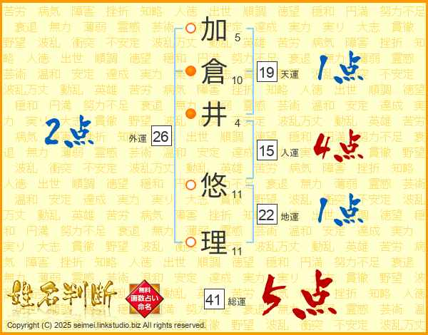 加(5画)倉(10画)井(4画) 悠(11画)理(11画)