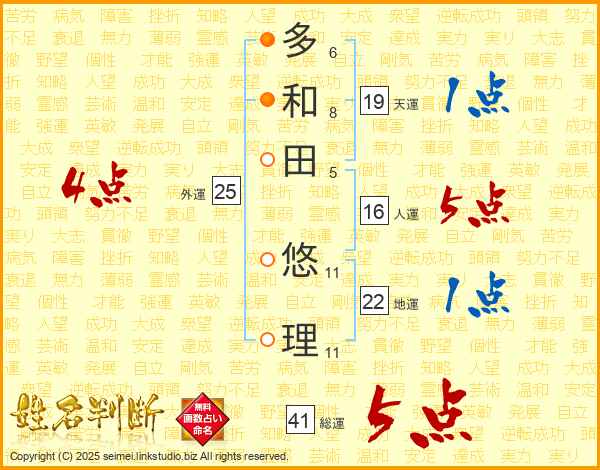 多(6画)和(8画)田(5画) 悠(11画)理(11画)
