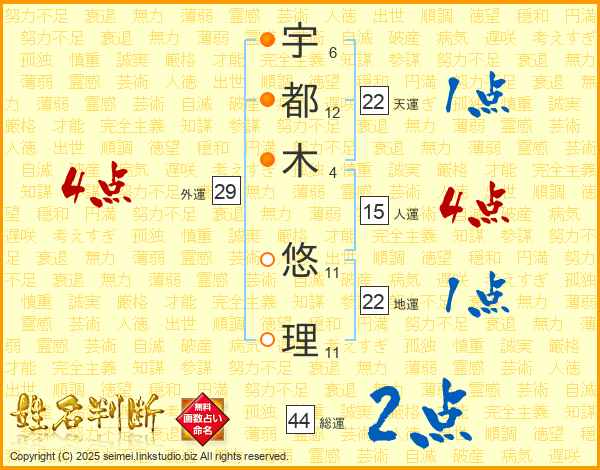 宇(6画)都(12画)木(4画) 悠(11画)理(11画)