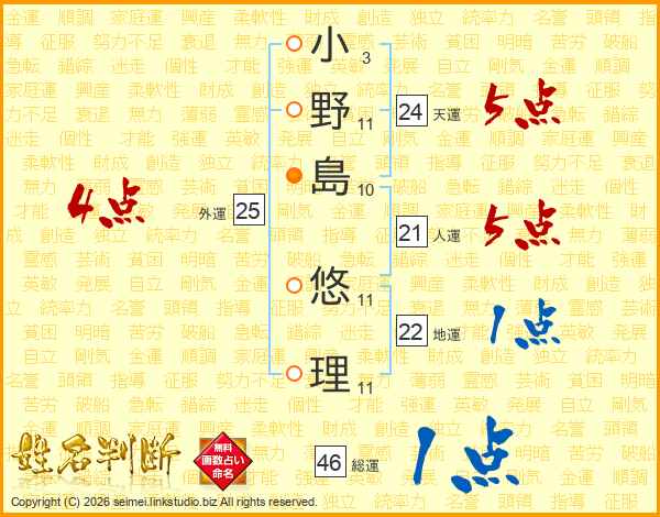小(3画)野(11画)島(10画) 悠(11画)理(11画)