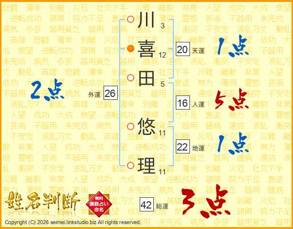 川(3画)喜(12画)田(5画) 悠(11画)理(11画)
