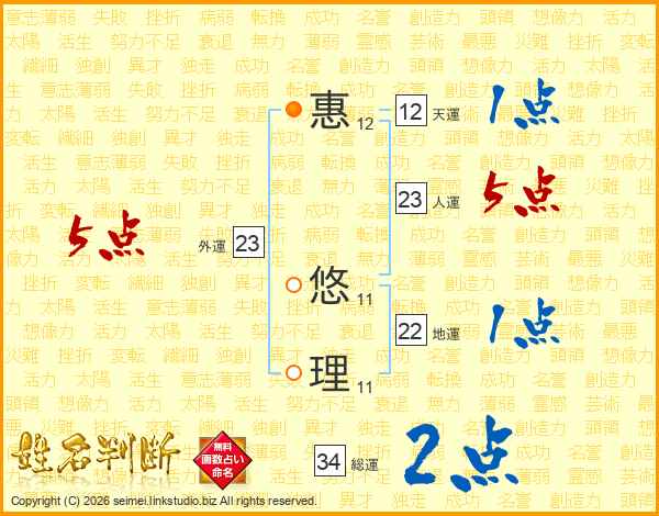 あなたの人生を表す1番重要な運勢です。生涯を通じて影響する総合運となり、主に50歳以降の晩年期に影響を及ぼします。苗字と名前の合計画数。