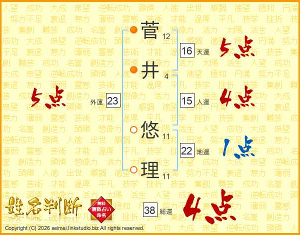 あなたの人生を表す1番重要な運勢です。生涯を通じて影響する総合運となり、主に50歳以降の晩年期に影響を及ぼします。苗字と名前の合計画数。