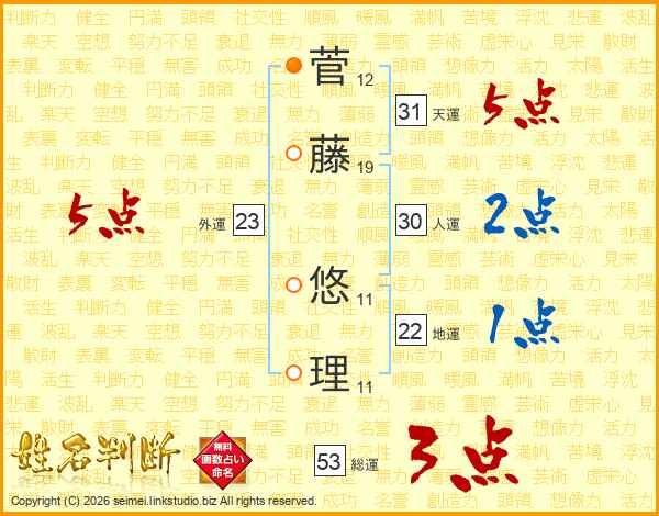 菅(12画)藤(19画) 悠(11画)理(11画)