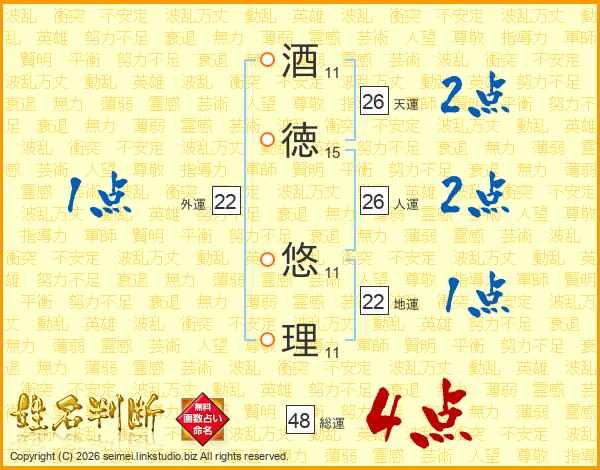 酒(11画)徳(15画) 悠(11画)理(11画)