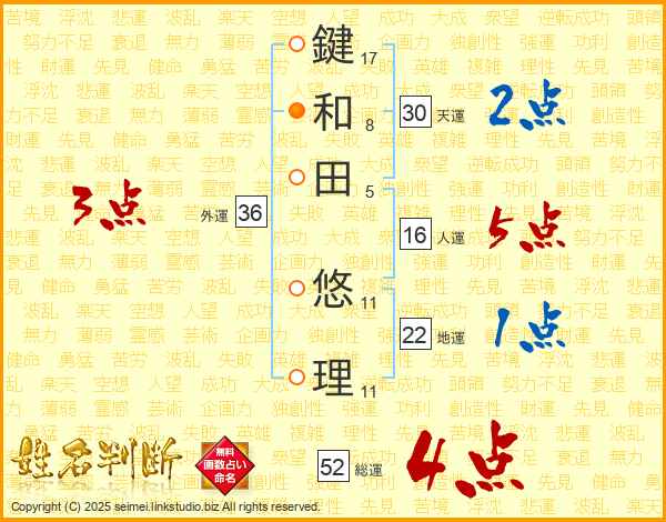 鍵(17画)和(8画)田(5画) 悠(11画)理(11画)