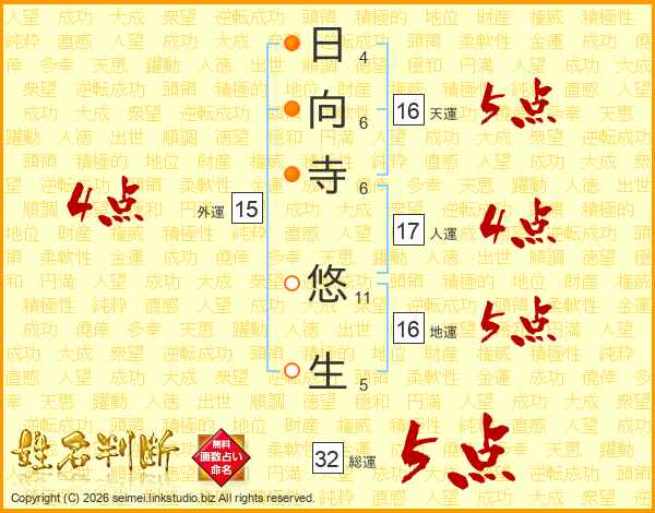 日(4画)向(6画)寺(6画) 悠(11画)生(5画)