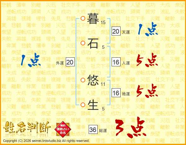 あなたの人生を表す1番重要な運勢です。生涯を通じて影響する総合運となり、主に50歳以降の晩年期に影響を及ぼします。苗字と名前の合計画数。