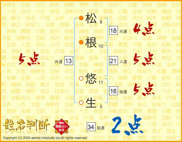 松根悠生さんの人運は21画の5点!