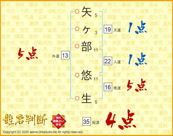 矢(5画)ヶ(3画)部(11画) 悠(11画)生(5画)