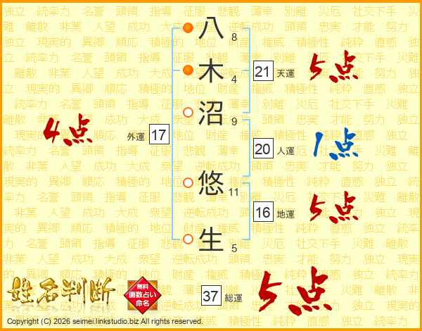 八(8画)木(4画)沼(9画) 悠(11画)生(5画)