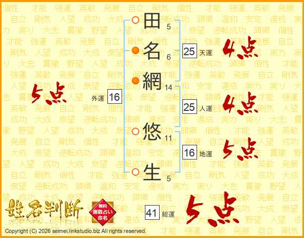 田(5画)名(6画)網(14画) 悠(11画)生(5画)