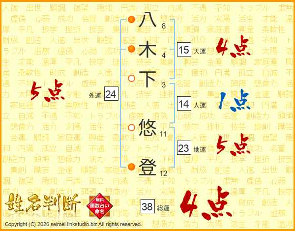 八(8画)木(4画)下(3画) 悠(11画)登(12画)