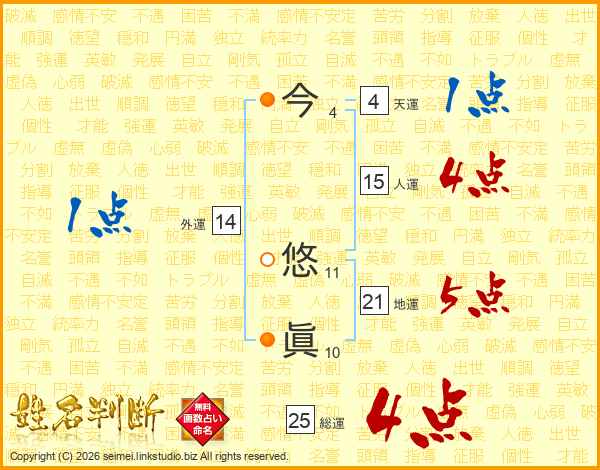 今(4画) 悠(11画)眞(10画)