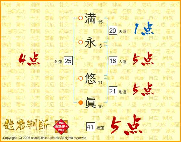 満(15画)永(5画) 悠(11画)眞(10画)