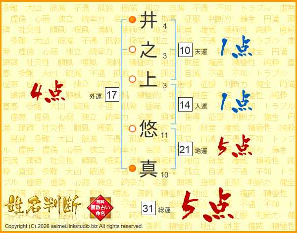 井(4画)之(3画)上(3画) 悠(11画)真(10画)