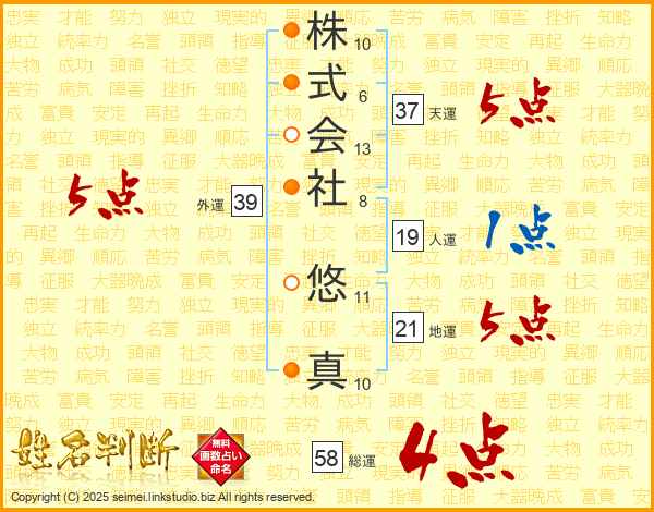 株(10画)式(6画)会(13画)社(8画) 悠(11画)真(10画)