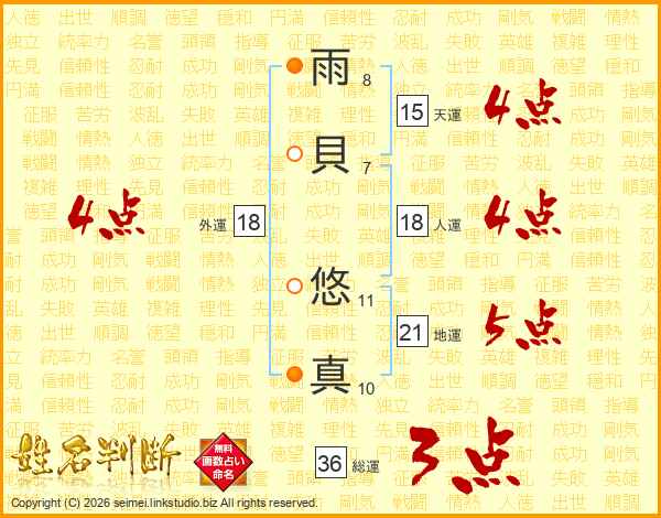 雨(8画)貝(7画) 悠(11画)真(10画)