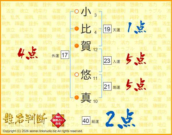 小(3画)比(4画)賀(12画) 悠(11画)真(10画)