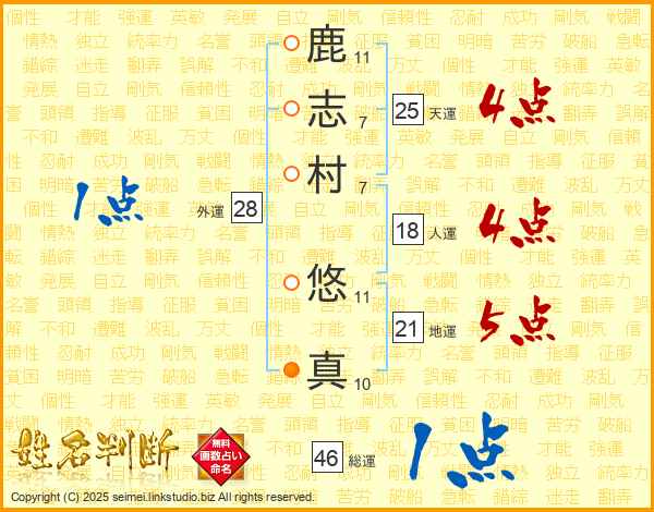 鹿(11画)志(7画)村(7画) 悠(11画)真(10画)