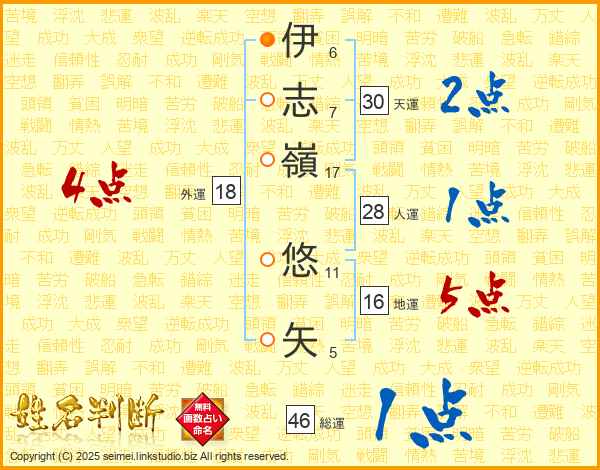 伊(6画)志(7画)嶺(17画) 悠(11画)矢(5画)