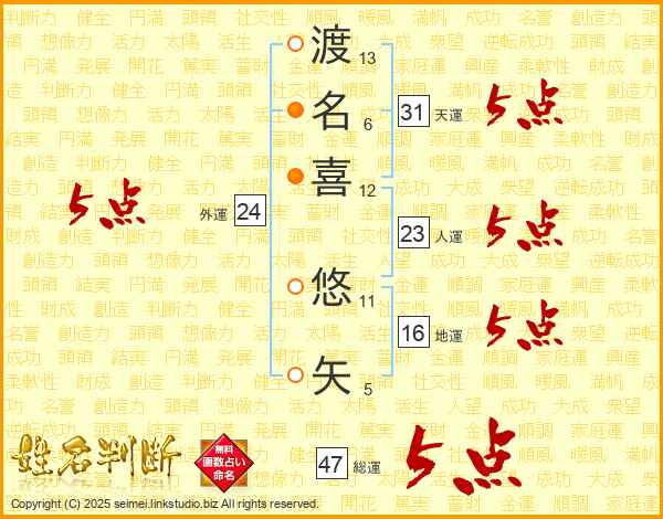 渡(13画)名(6画)喜(12画) 悠(11画)矢(5画)