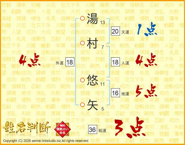 湯(13画)村(7画) 悠(11画)矢(5画)