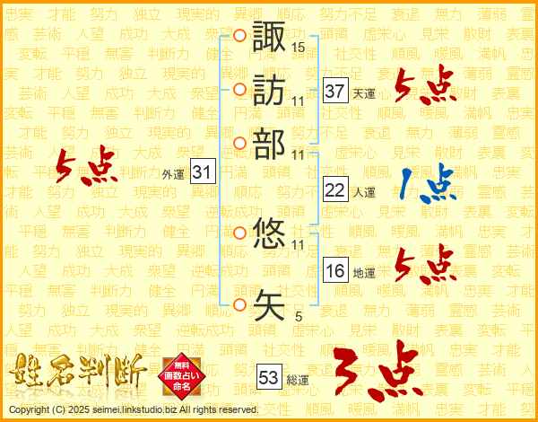 諏(15画)訪(11画)部(11画) 悠(11画)矢(5画)