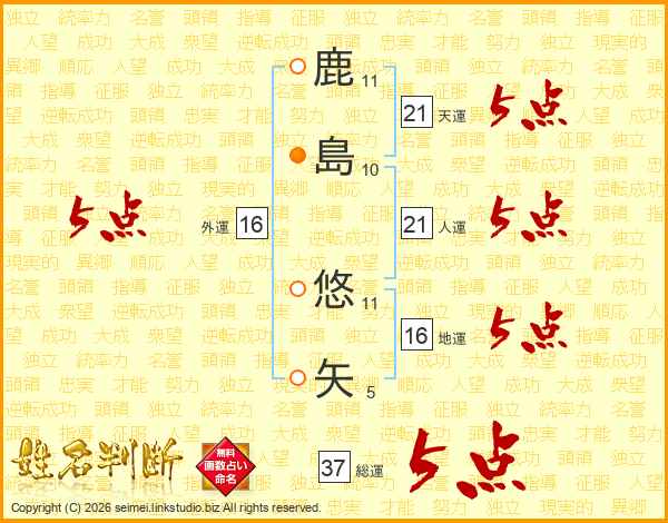 鹿(11画)島(10画) 悠(11画)矢(5画)